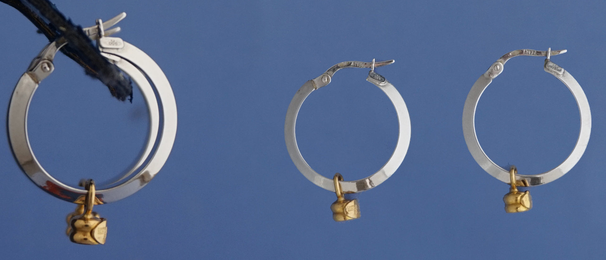Platinum hoop earrings are lightweight yet pleasing. They have a dangling 22k Gold charm. Being two tone, it will match with most jewelry.